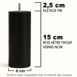 Apportez élégance et stabilité à votre lit avec nos pieds de sommier en bois de hêtre massif, vendus par lot de 4, hauteur 15 cm, diamètre 6 cm, avec filetage universel M8 (longueur 2,5 cm). Chaque pied supporte jusqu’à 500 kg, assurant robustesse et sécurité au quotidien.