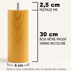 Apportez élégance et stabilité à votre lit avec nos pieds de sommier en bois de hêtre massif, vendus par lot de 4, hauteur 30 cm, diamètre 6 cm, avec filetage universel M8 (longueur 2,5 cm). Chaque pied supporte jusqu’à 500 kg, assurant robustesse et sécurité au quotidien.